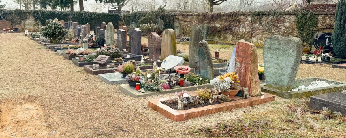 - Die Position der Grabstätte auf dem Friedhof kann nicht gewählt werden. Die Belegung erfolgt im jeweiligen Grabfeld der Reihe nach.